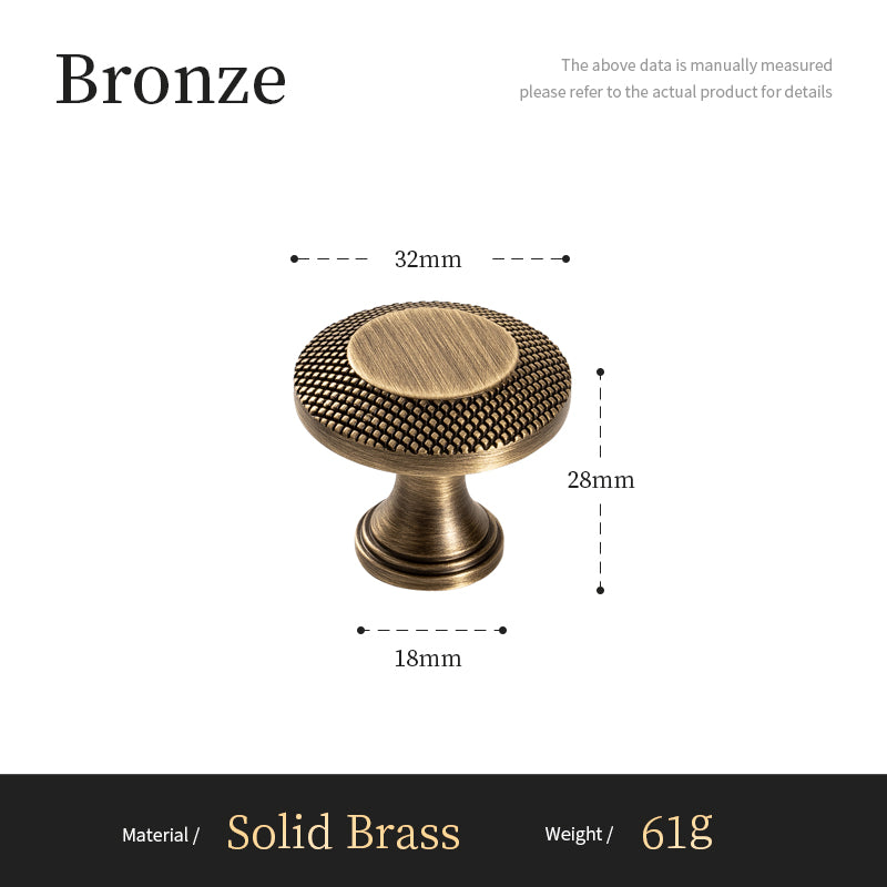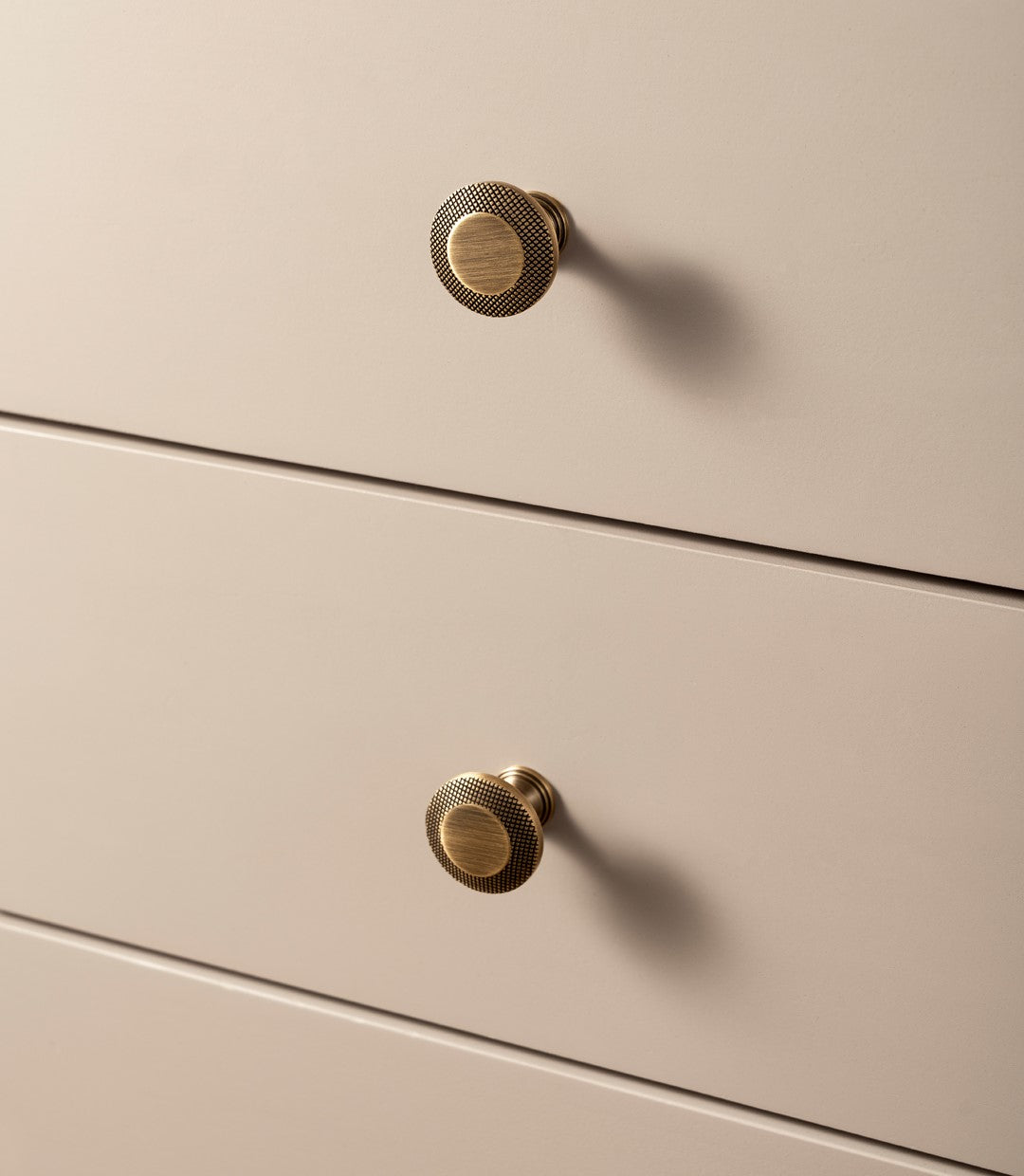 The Aurex Knob in brushed brass features a striking contrast between its smooth central surface and precisely knurled edges, offering a perfect blend of elegance and functionality.